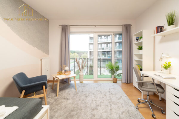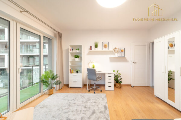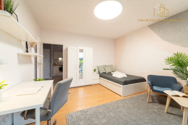 Pokój jest niezależny zamykany na klucz i pełni umeblowany w biurko, krzesło, wygodne łóżko w rozmiarze 120×200, szafkę nocną, dużą szafę na ubrania, półki na książki.