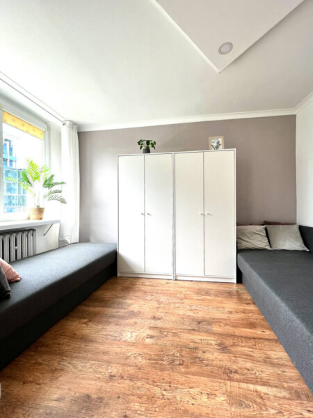 W każdym pokoju oraz w przedpokoju znajduje się duża szafa, gdzie z pewnością pomieścisz wszystkie swoje rzeczy.