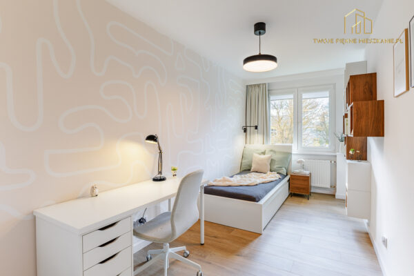Pokój jest niezależny zamykany na elektroniczny nowoczesny zamek na kod i pełni umeblowany w biurko, krzesło, wygodne łóżko, dużą szafę na ubrania, lampkę biurkową. Okna posiadają rolety wewnętrzne, oraz dodatkowo zaciemniająca zasłona dla komfortu wypoczynku.